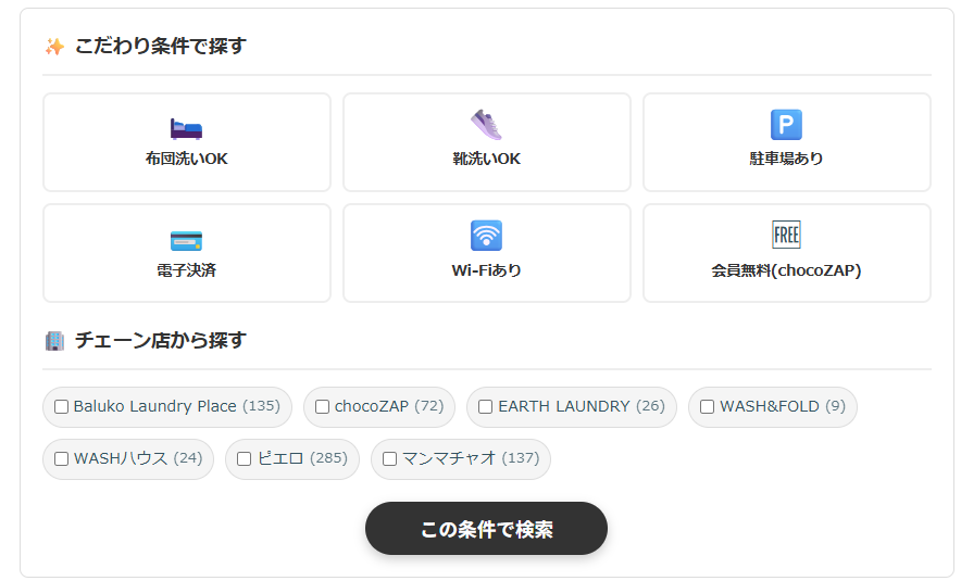 実は、当サイト「東京コインランドリー検索」では、ただ場所を探すだけでなく、こうした「設備条件」での絞り込み検索が可能です。