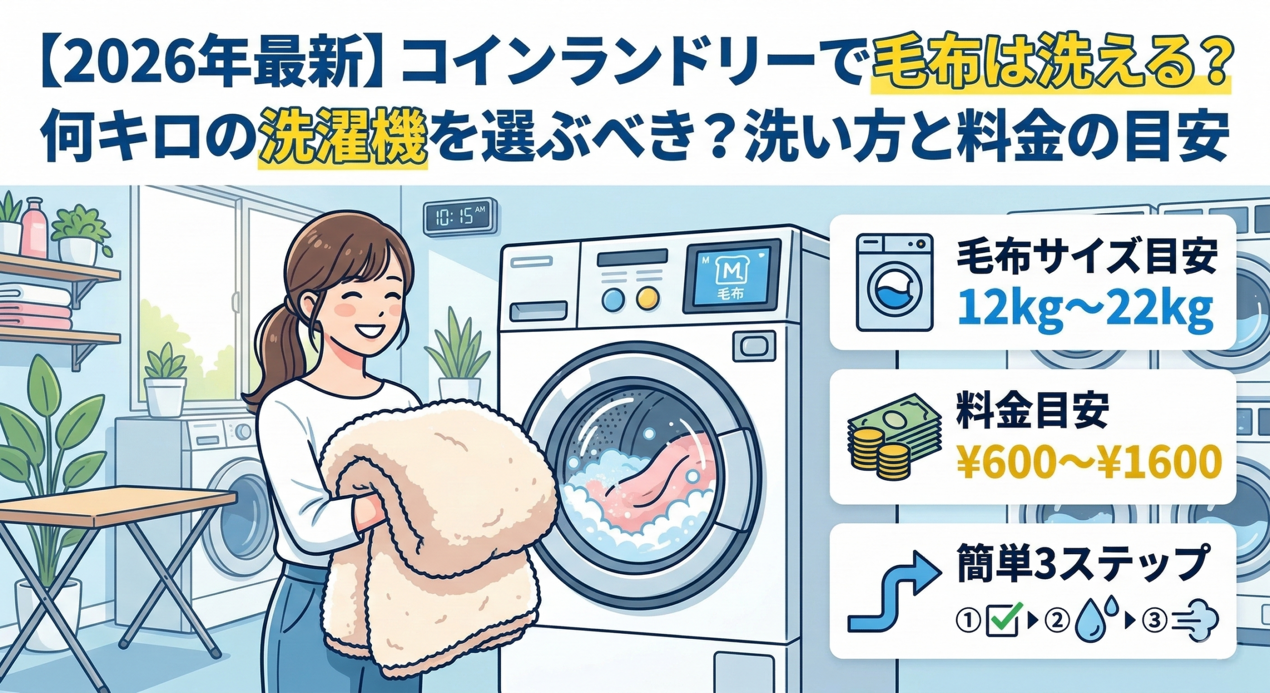 コインランドリーでの毛布の洗い方を徹底解説!失敗しない洗濯機の容量選び(12kg〜22kg)や、1,000円〜1,500円の料金目安、ふわふわに仕上げる乾燥のコツを紹介します。